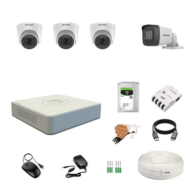 HIKVISION 4 Channel DVR with 5MP 3 Dome & 1 Bullet Cameras with Audio Recording (Day/Night Vision) + 500GB HDD + Copper Cable Roll (1+3) 4 CH Power Supply + BNC & DC Full Combo Kit